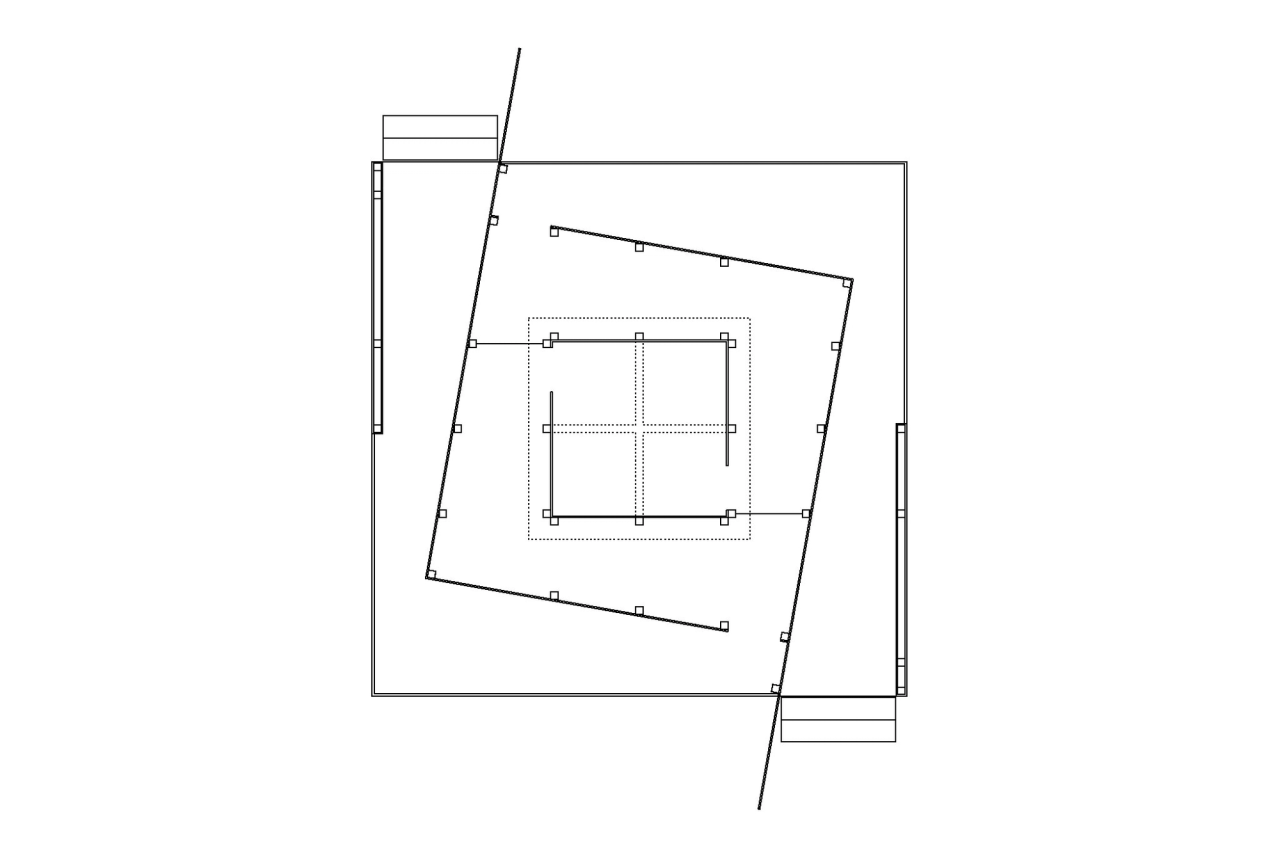 The plan of the pavilion consists of three nested squares, building up a cubic room in the middle and two layers of passages surrounding it. The first square is the outer skin with Suzuki’s drawings on glass, dropping their shadows onto the white wall of the second square. Between the second and third square, a dim in-between space with black walls and light entering only softly through the narrow overhead lights is to make visitors forget their surroundings. The third square is a white cube in the middle with Suzuki’s drawings on the glass ceiling. Cut off from the outside environment, the sun casts strong shadows of the art that steadily wander along the walls during the cause of the day.
