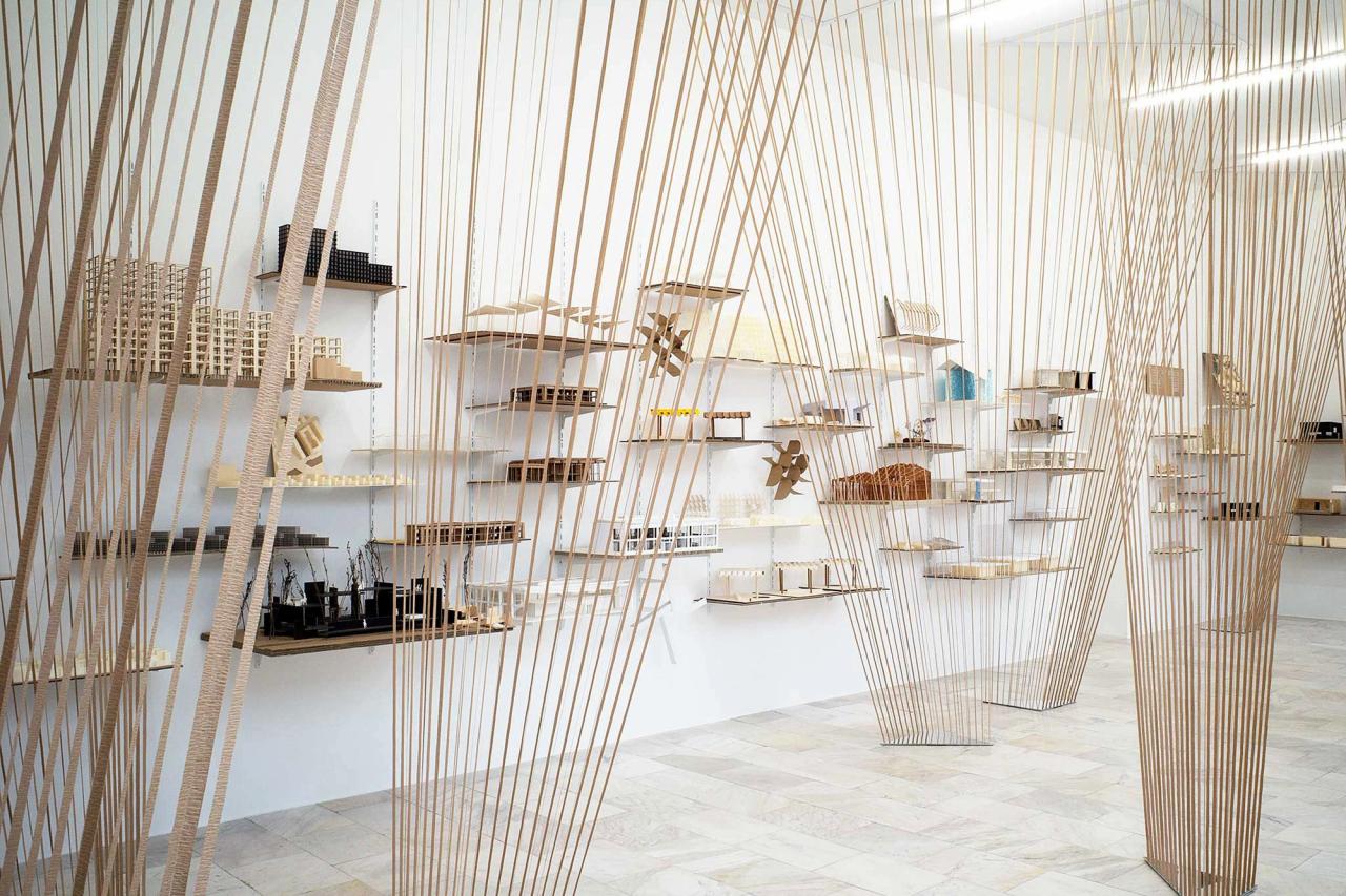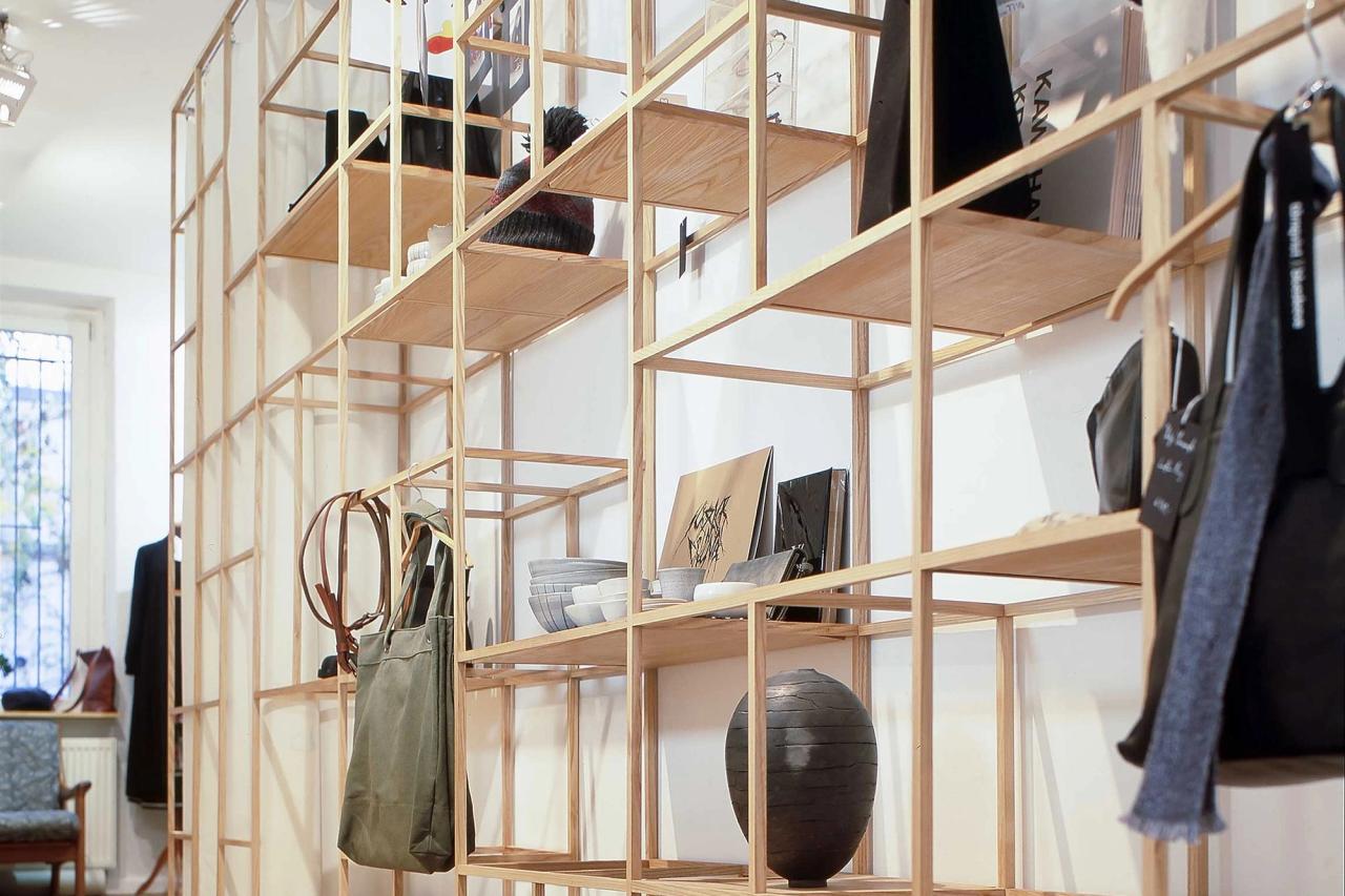 The core element of the design is a wooden shelf at the heart of the shop stretching from floor to ceiling. Based on a spatial grid, some of the elements of the grid were omitted to create shelf compartments of various shapes and sizes. Instead of a neutral, regular grid this allows a high variety to display different items. This flexibility is further enhanced as the boards of the shelf follow the basic grid size allowing an easy rearrangement of the boards. The basic grid is as slender as possible as to give a delicate impression. Where the corridor in which the shelf is located opens up into the back room, the spatial grid widens up to enclose the changing room, evolving as one continuous element.