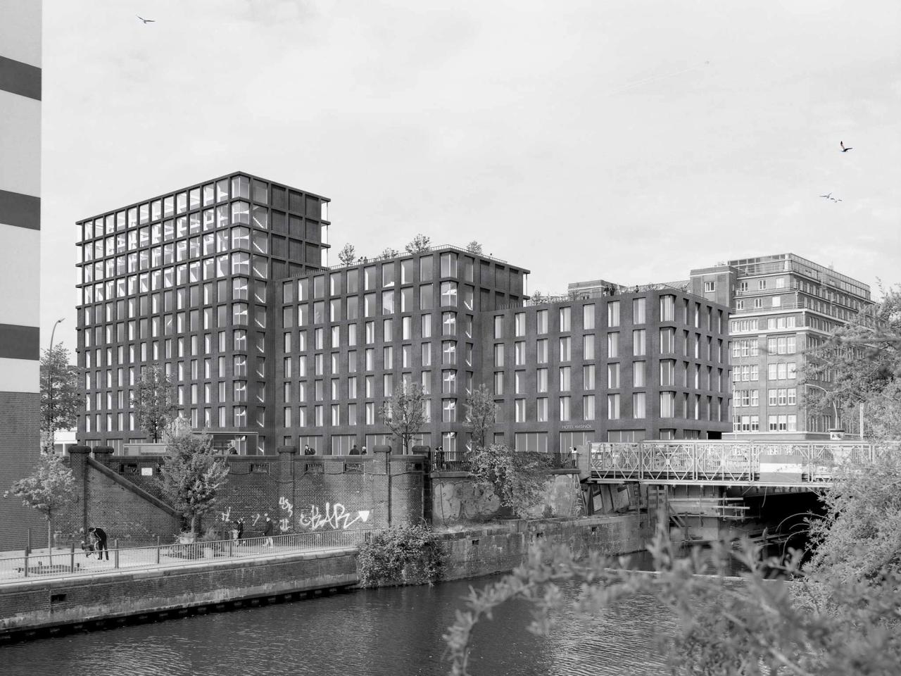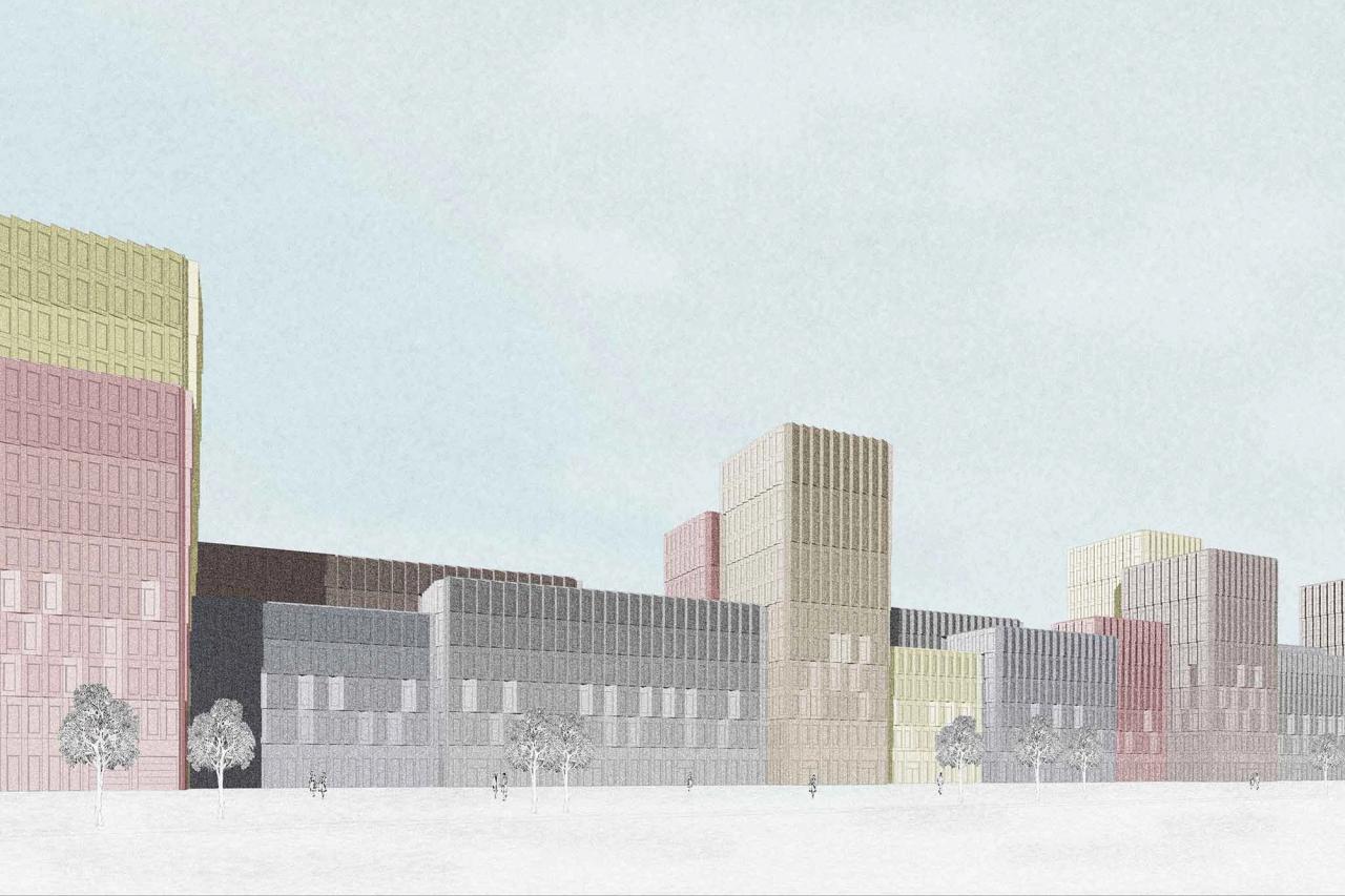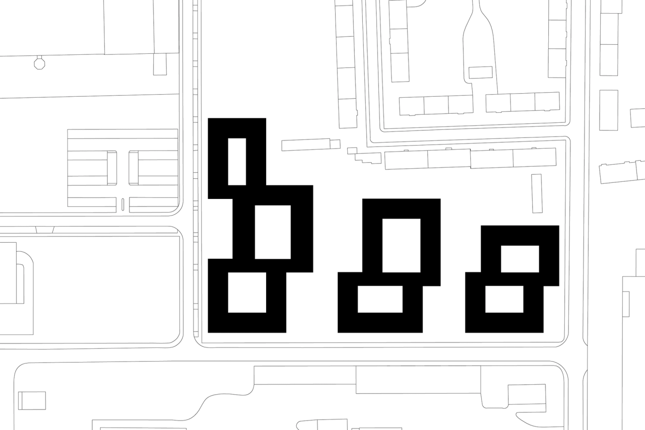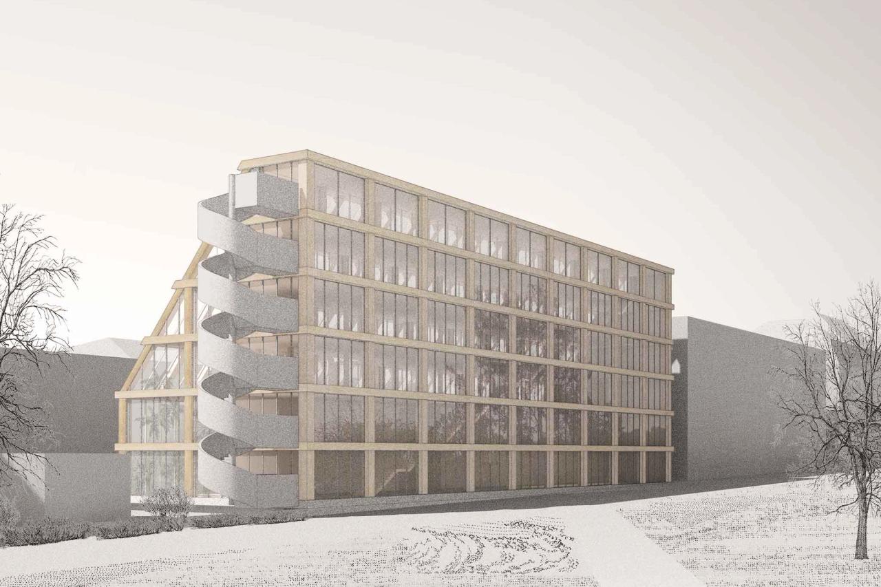 sind ihnen kleine, private Gärten als Schwelle zur Gasse vorgelagert. Dieses die Gebäudevolumen umgreifende Grün bildet an den kurzen Gebäudeseiten die Basis für eine an den Fassaden hochrankende Begrünung. Alle drei Gebäudevolumen bilden einen tiefen, zweigeschossigen Sockel. Die Geschosse darüber springen zurück, so dass aus Fußgängerperspektive vor allem der zweigeschossige Sockel den Stadtraum in den Gassen prägt. Somit wird die Wahrnehmung der großen Gebäudevolumen zugunsten eines belebten Quartiers dem menschlichen Maßstab angepasst. Die Obergeschosse sollen in Holzbauweise erstellt werden. Sie ruhen auf den tiefen, zweigeschossigen Sockeln die ebenso wie die Untergeschosse und Kerne in Stahlbeton ausgeführt werden. Diesem Konstruktionsprinzip folgen alle drei Gebäude.