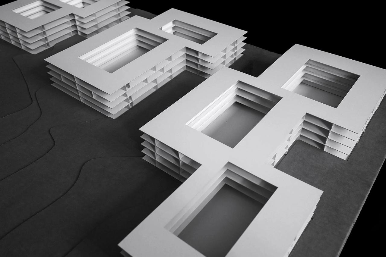 The new residential area at Egginger Weg in Ulm aims to provide an attractive living environment for a broad population. The quarter makes up an urban area of its own while being bound to its context by connecting paths and a similar scale. Green voids split up the site into three smaller neighbourhoods. The alternation of residential quarters and public green spaces ensures high living standards. The residential quarters are arranged around common green areas that form the heart of the neighbourhood and strongly connect the community. Multiple paths in east-west-direction open up into smaller green areas that stimulate gathering and communication.
