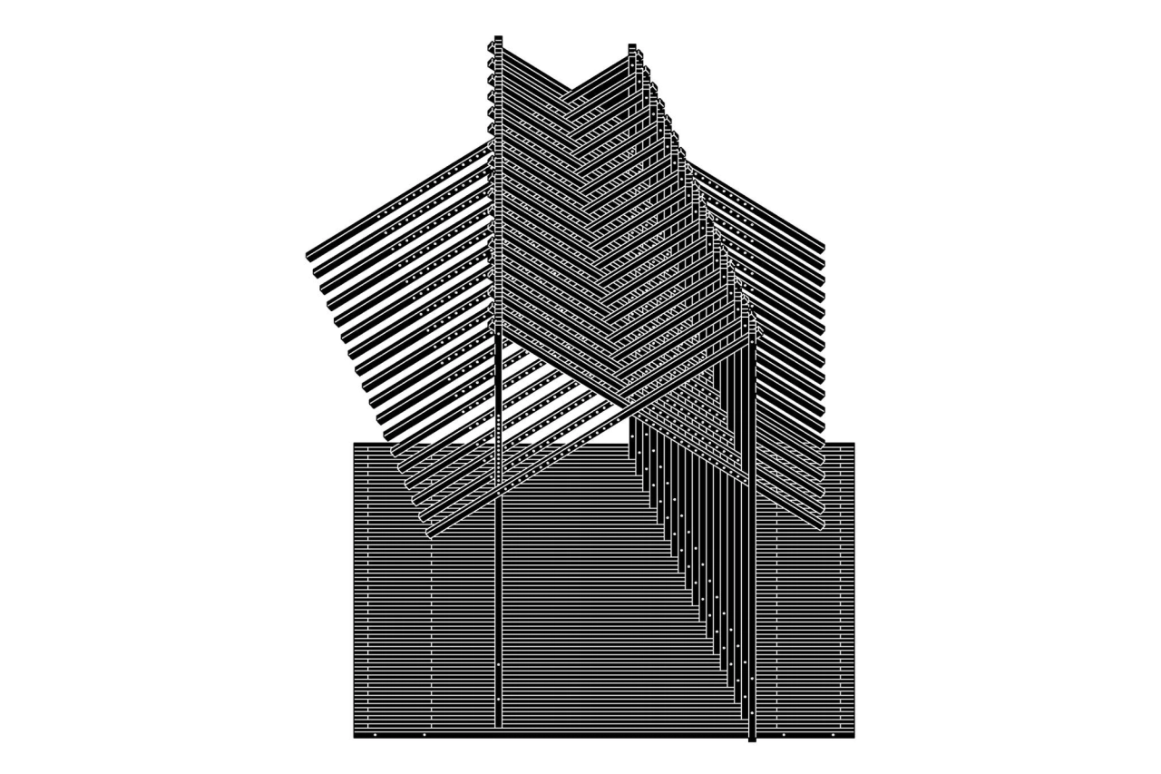 The space is created by only two walls. They open up towards the entrance and narrow the space towards the cross thus directing the movement to the inside. The deep roof shades the space underneath while the wind passes through the hut in summer. By using the on site firewood in the garden and granting it a new use, an unusual space emerges just a few steps outside the house providing a shelter for contemplation and prayer away from daily life.