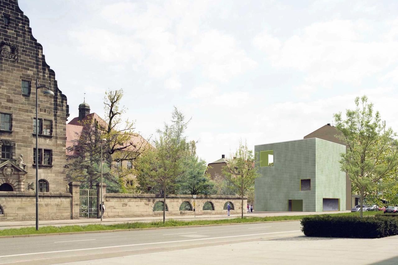 The most important aim of the design for the new visitor centre and the redesign of the surrounding area at the Memorium Nuremberg Trials was not to obstruct the view on the east wing from Fürther Straße, but at the same time to create an address-forming entrance. The new building was therefore largely placed underground, creating an open square. A green tiled building cube on Fürther Straße forms the entrance. On the one hand, it marks the location and at the same time preserves the view of the east wing as well as the historical images that have entered the collective memory.