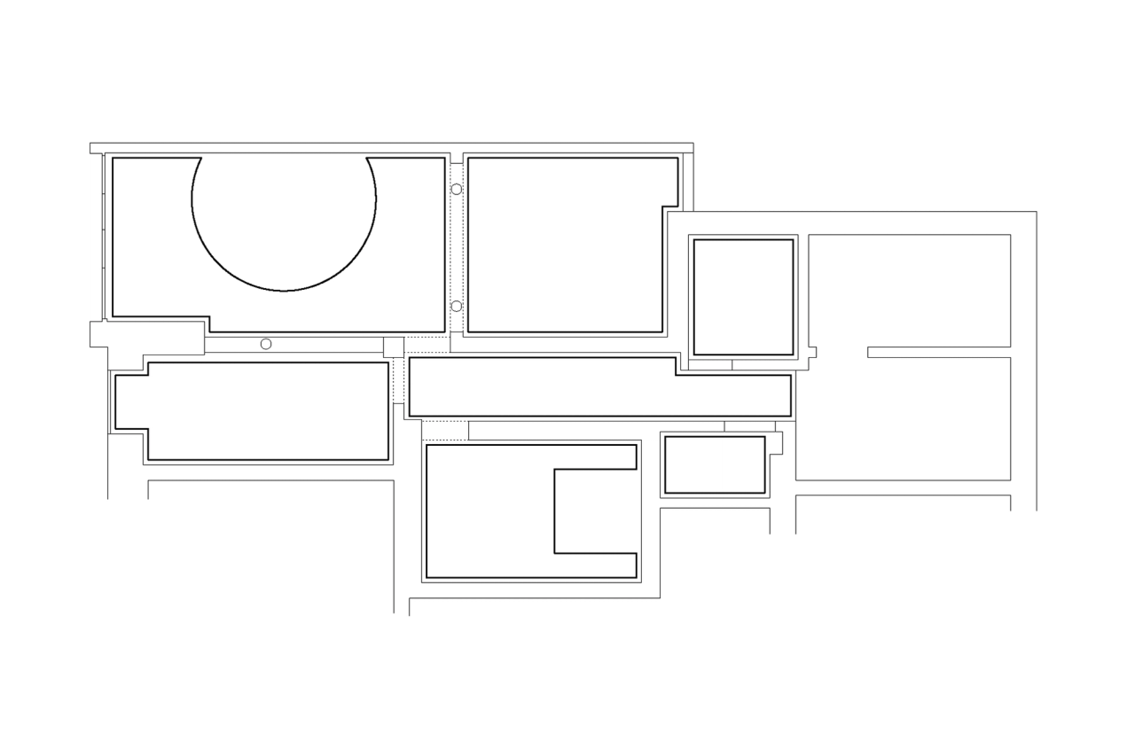 The underground part of the building is organized around a light-giving patio planted with winter cherries. The two large seminar rooms are arranged directly next to it as courtyard-like glass cubes, so that these three volumes form the bright centre of the building. The areas of the visitor centre form an open, flowing space around them. The functional areas and the special exhibition as an enclosed space form the outer ring of the underground part of the building. From here, a stair leads up to a small entrance pavilion in front of the old building, allowing direct access to the east wing.