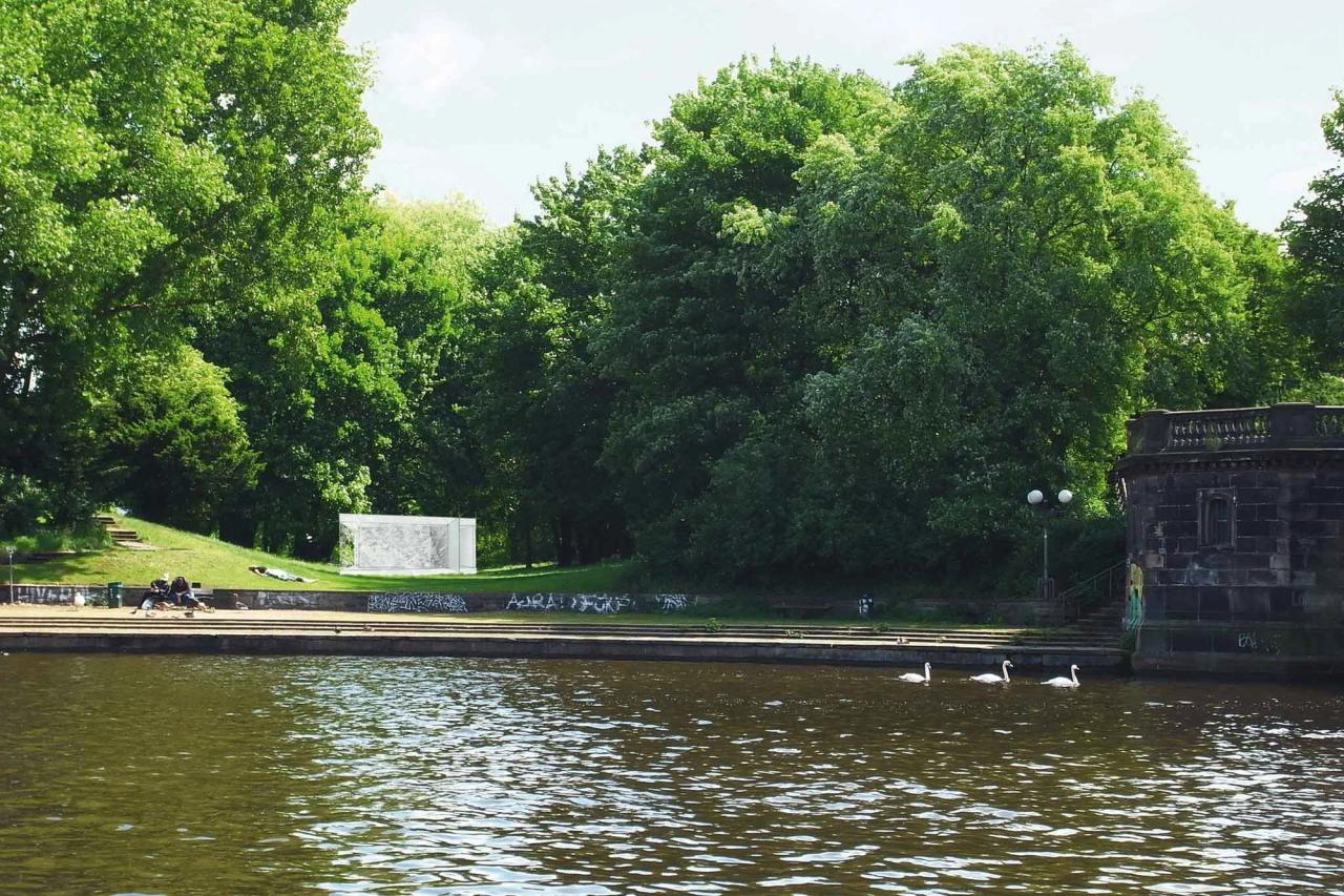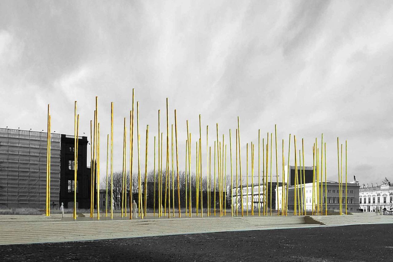 70.000 protesters on the Great Monday Demonstration in Leipzig achieved to spread the revolution all over the GDR. 70 golden blades sparkle in the sunlight, their reflections glare and they flex and sway in the wind but don’t break. They withstand the elements as time passes. Their shadows wander from east to west. The remaining base is accessible to everybody at all times, thereby making it a place for people to meet and gather. A monument of interaction.