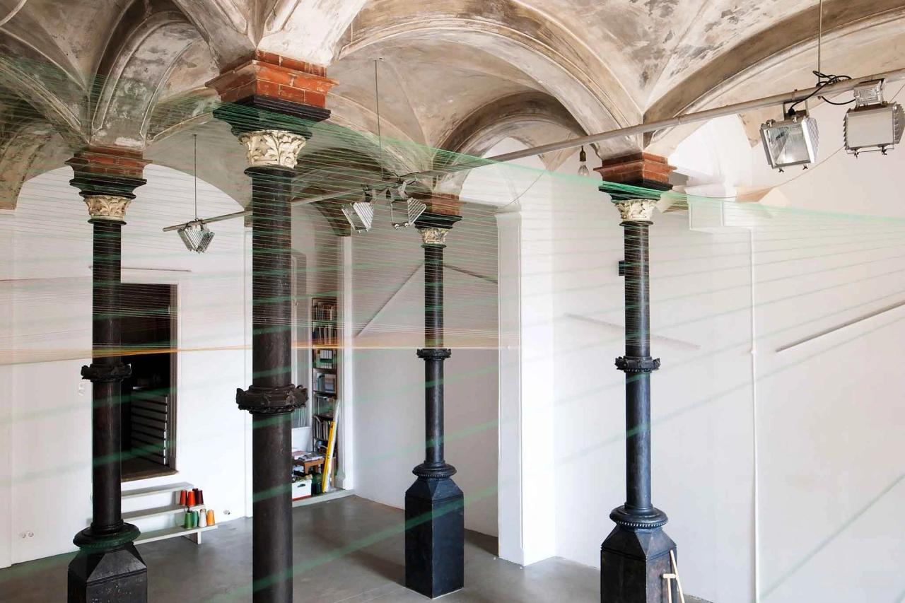 Two massive, black stairs are newly inserted in the middle of the room for this installation. They melt with the existing black bases of the columns, creating a heavy counterweight to the weightless installation above. By climbing up these stairs the perception of the space drastically changes. Each step varies the composition of threads that appear as colourful lines and surfaces or melt into the space beneath. As the visitor finally pops up his head into the space above, the apparent surface of the installation becomes an ephemeral horizon that seems to slip. The vaults of the exhibition space obtain a new counterpart, the visible space cambers up and down. The field of vision and the perspective view of the space shift, being steadied by the depth-less paintings of Japanese artist Nobuko Watabiki above and below the installation.