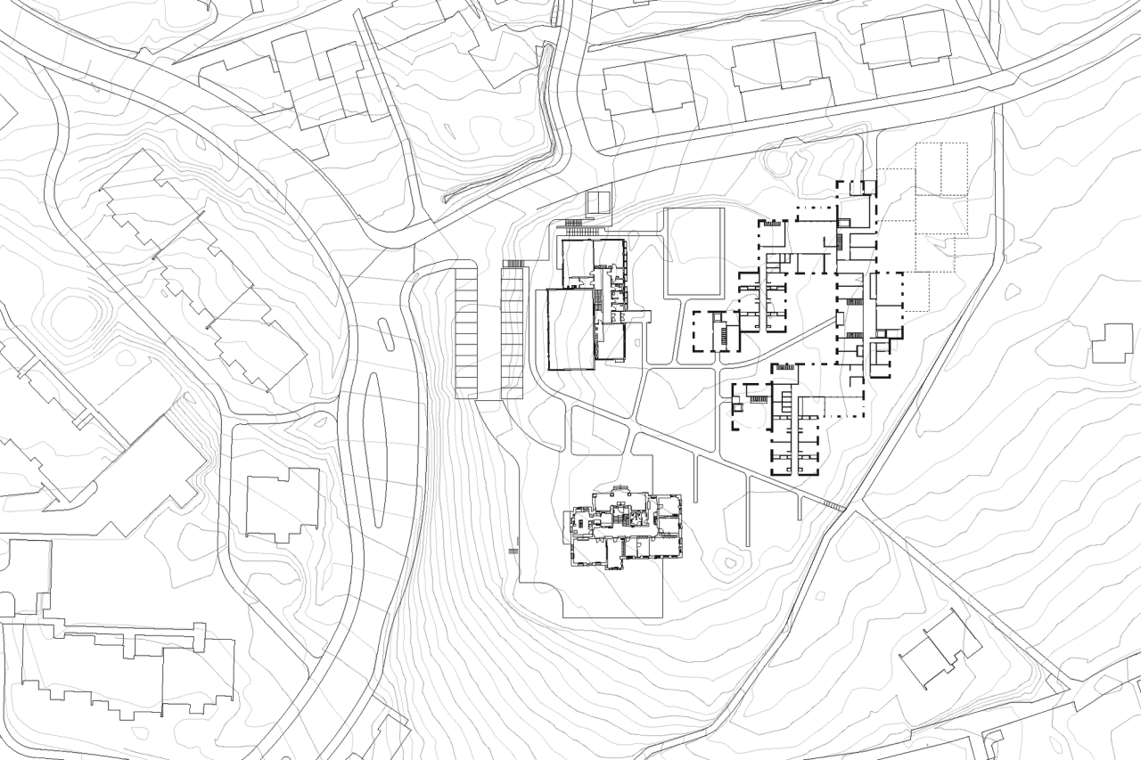 For a psychiatric ward for children in a small village close to Zurich, a new building to house lodgings, a cantina, a day-nursery and various treatment rooms was to be planned as an expansion to an existing 19th century building. Comprising all the functions required, the existing volume seemed too big for its rural surroundings and the small hill on top of which the psychiatric ward is located. Instead of a single, massive volume that would seemingly suppress the hilly landscape and would compete too much with the old grand main building, we broke down the volume to integrate the new complex in its small scale environment.