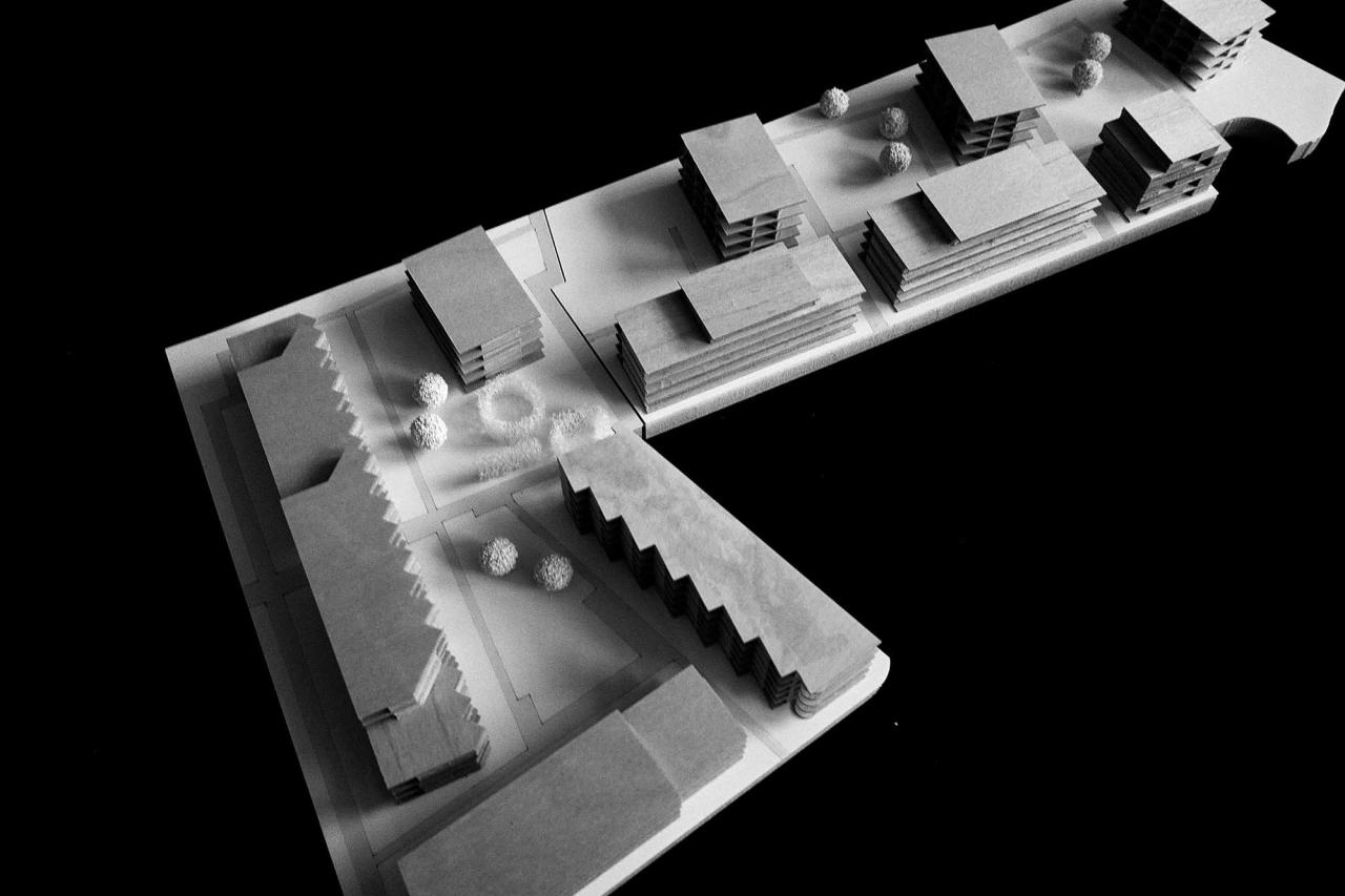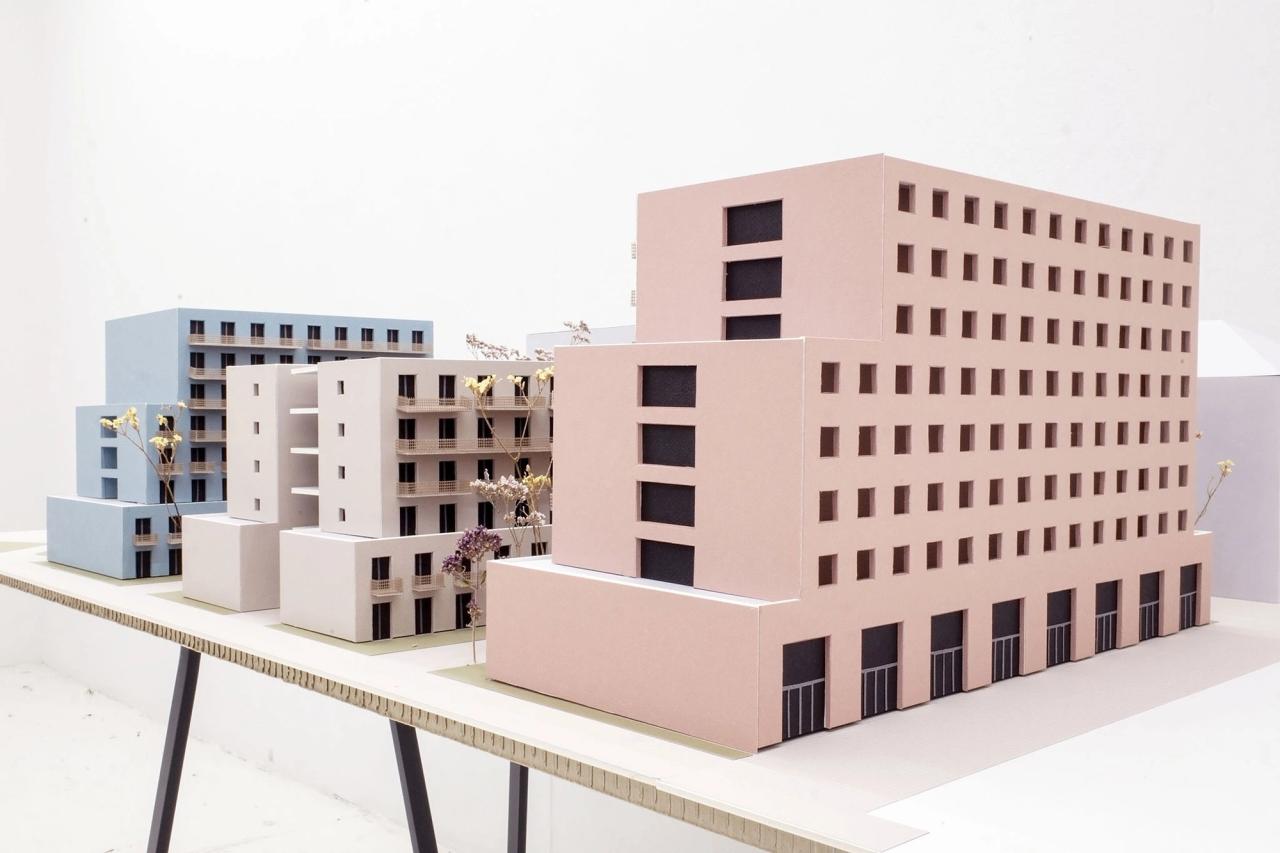 The typologies proposed respond to the characteristics of the site as well as the multiple needs of a broad population. A huge variety of apartment sizes and typologies such as classic flats, maisonettes and loft apartments fulfil the needs of different inhabitants. The highest buildings are set parallel to the street in the North to stifle the noise. Access balconies and a functional zone of kitchens, bathrooms and storage rooms make up a buffer for the apartments that are solely oriented towards the South.
