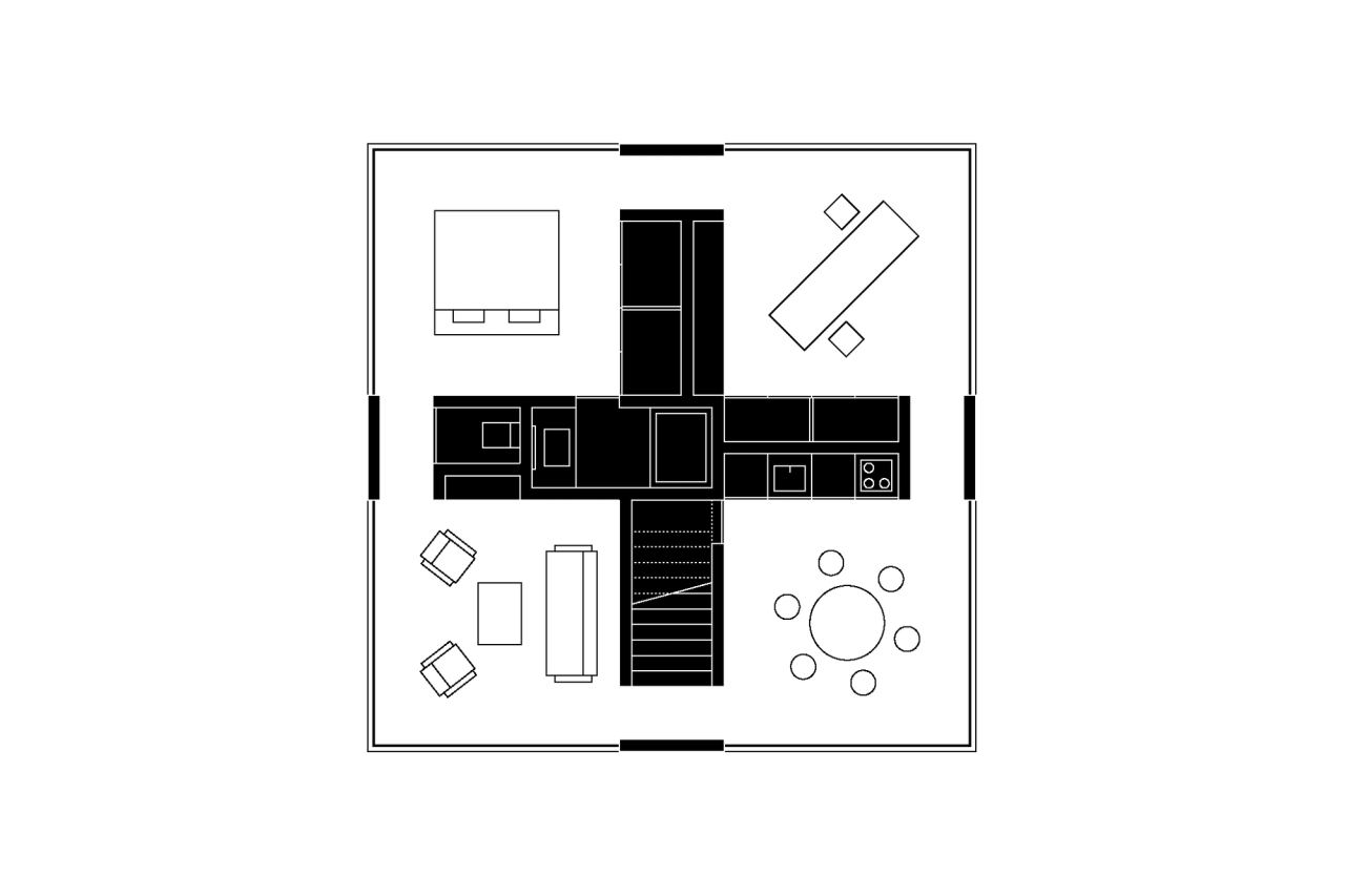 The house is entered on the north side via a spacious entrance area, which opens via sliding doors to the open-plan kitchen or directly to the living area. The living area is characterized by the double height space to the first floor. A wraparound gallery around the opening on the first floor provides visual connections, while the master bedroom can be separated from it via sliding doors. The south-west quadrant of the floor plan thus becomes the connecting element of the house across all levels thanks