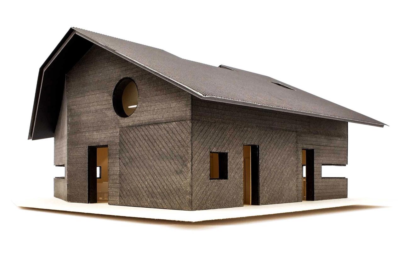 The shelves also have a structural use. A single structural system was developed for the walls and the roof of the building: short and therefore economic timber planks are arranged in a windmill layout forming a continuous grid structure doubling up in the walls, thus creating book shelves. The roof is covered with oversized wooden shingles, its overlaps leaving small slits that allow the light to fall inside