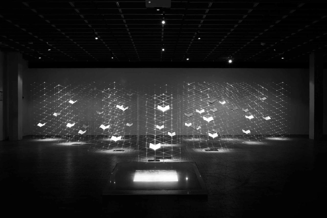 The structure consists of transparent straws used in every day’s life for drinking, which are connected by joints made of acrylic glass. An ephemeral and transparent net is being created that gives hold to the books in space. The space itself is not strictly defined, it is not limited by any borders. The structure rather implies the depth of an open and flowing space. Depending on the viewpoint the structure seems to dissolve while the importance of the books is being emphasized.