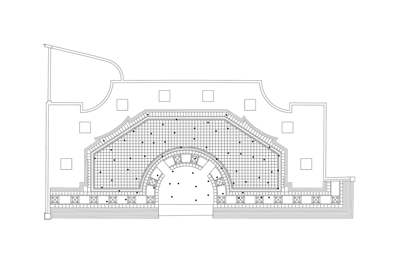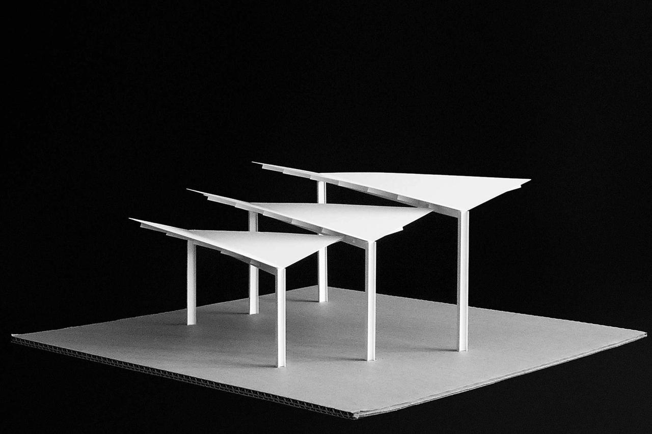 The new roof stands on wall-like columns that are arranged in a rectangular fashion to the Rathaus and therefore strengthen the idea of permeability towards the city hall. These wall-like columns divide the interior space in a very subtle way. They are positioned towards the centre of the pavilion rather than on its edges thus keeping distance from the existing structure and preventing a concentration of mass on the ground level.
