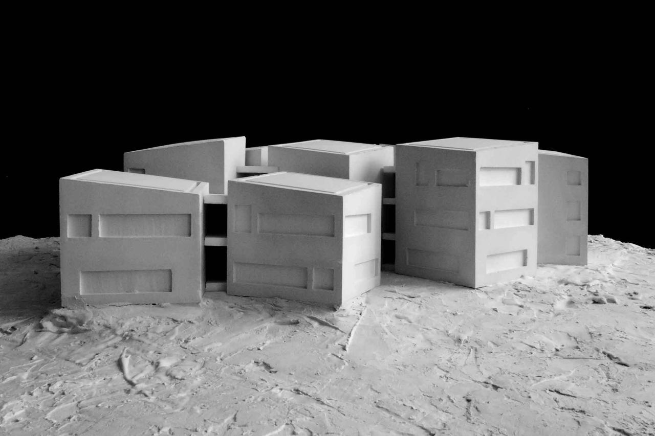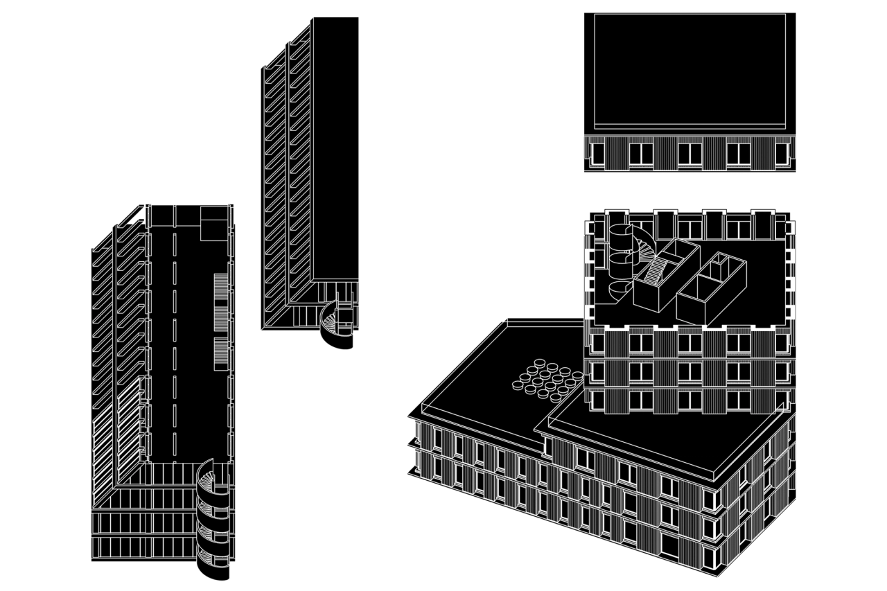 For the city of Regensburg an apartment building was developped that – despite its rational and economic construction – offers various ways of living in the community of the neighbourhood due to a subtle graduation from public to private space. The degree of public athmosphere gradually diminishes from the park-like surroundings to the inner courtyards and access balconies that are used by the community via the living modules that open up to it to the private bedroom modules.