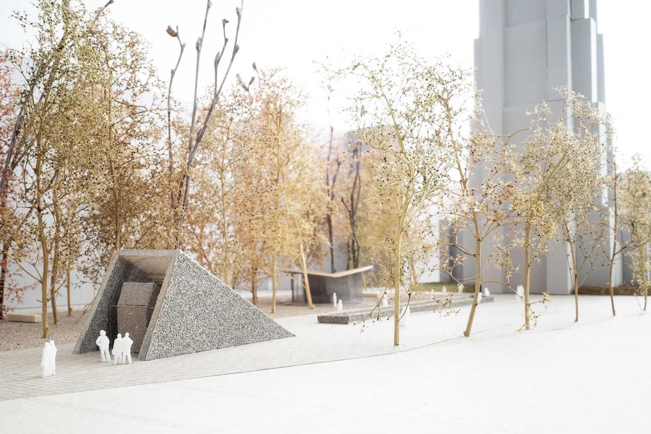 The redesigned square area of the Memorium mediates between the surrounding architecture and the existing building with a uniform surface of large-format sandstone slabs. In the rhythm and style of the entrance building and patio, undulating hedge structures organise the new square in such a way that pleasantly proportioned open spaces are created for people to linger and pass through. White ash and aspen trees on the square cast light shade with their beautiful structure and leaf texture. A particularly lush new planting behind the existing wall, on the other hand, is reminiscent of historical photographs and contrasts with the open square.