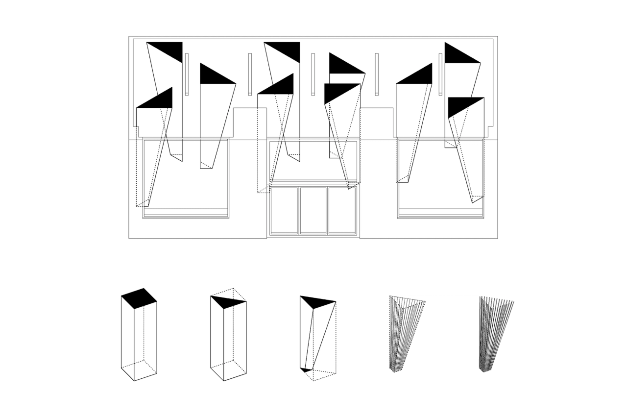 The design of the façade intends to loosen up the rigid impression of the pragmatic hotel grid. The elevation was divided into t-shaped elements, which are to be constructed as three-dimensional precast modules. These elements feature a vertical crease, strengthening the height of the building and breaking up its horizontal length. Five different elements (with the crease leaning towards the right or left) of the same t-shaped façade surface can be arranged in numerous combinations, creating variations in the façade. With these few basic elements a diversified façade elevation emerges.