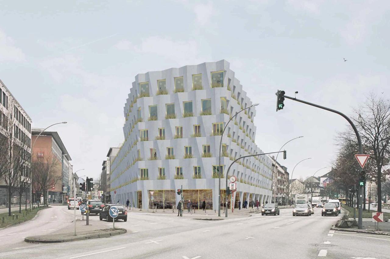 For this new hotel in Hamburg St. Pauli a building was designed that speaks a unique architectural language in response to its significant location next to the Heiligengeistfeld. The design also reacts to the immediate context of the surrounding streets. The folded street façades create an alternation, breaking up its length, especially along the Simon-von-Utrecht-Straße. On ground level, the grid of the façade widens to open the building to the public space.